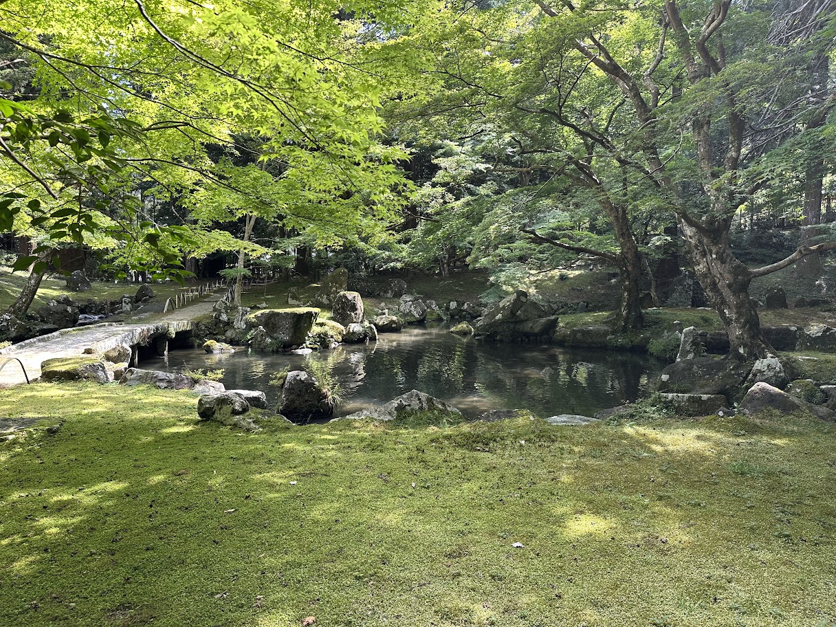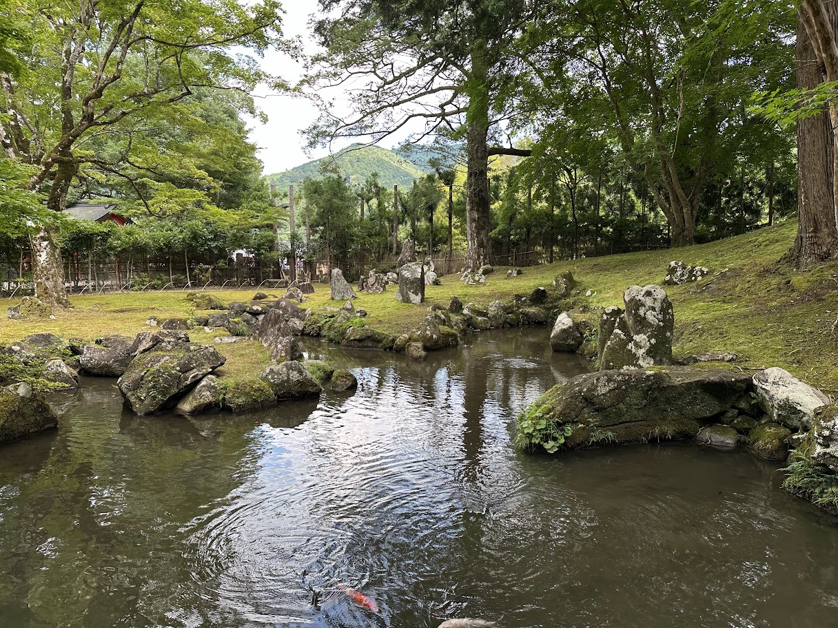 静寂の中、鯉がはねる音と、蝉の鳴き声がするだけで、とても静かで心が落ち着く場所です。